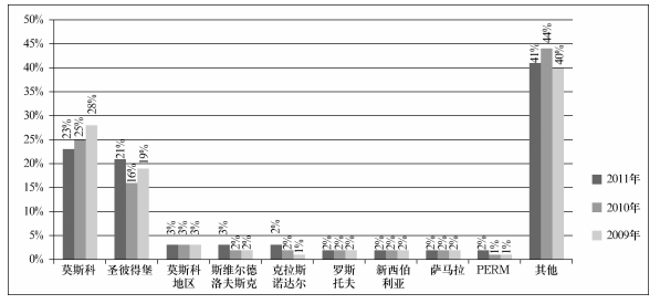 俄羅斯境內(nèi)有300多家公司從事安防產(chǎn)品的銷售和服務(wù),但由于區(qū)域消費(fèi)水平和安防產(chǎn)品需求量的不同,至少超過(guò)55%的安防公司和用戶集中分布在莫斯科和圣彼得堡境內(nèi),其他地區(qū)合起來(lái)僅占45%,具體分布情況如下圖: