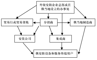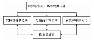 除此之外,地產(chǎn)公司、各大銀行、零售店、能源企業(yè)(石油和天然氣)等實(shí)體機(jī)構(gòu)同樣作為安防產(chǎn)品的購(gòu)買(mǎi)商和終端用戶,他們的購(gòu)買(mǎi)力也不容忽視,總需求量占俄整個(gè)安防市場(chǎng)的50%以上。在上文的俄羅斯安防市場(chǎng)背景中已經(jīng)提到,俄安防企業(yè)主要為分銷商和系統(tǒng)集成商,同時(shí)還包括少量產(chǎn)品制造商、解決方案供應(yīng)商、安防產(chǎn)品零售商和安防設(shè)備安裝和服務(wù)公司,共同組成了俄羅斯安防市場(chǎng)的參與者,基本結(jié)構(gòu)圖如下: