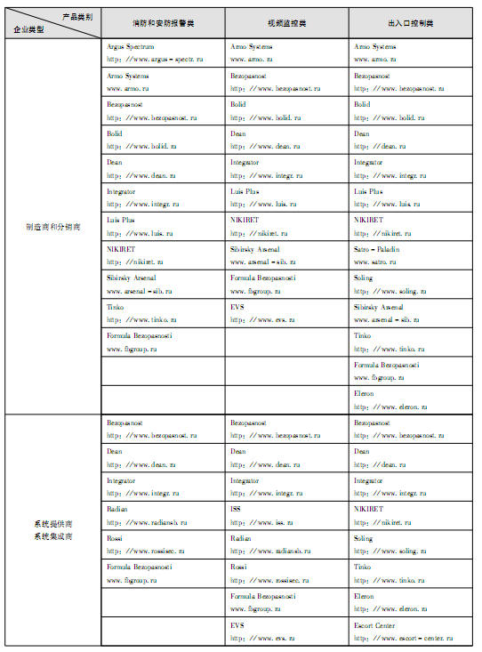 為了便于我們國(guó)內(nèi)有意向進(jìn)入俄羅斯市場(chǎng)的企業(yè)準(zhǔn)確尋求到俄當(dāng)?shù)乇容^有實(shí)力的合作商,現(xiàn)將這300多家安防企業(yè)內(nèi)具備較強(qiáng)實(shí)力的公司列出,供我們國(guó)內(nèi)企業(yè)參考,詳情見(jiàn)下表: