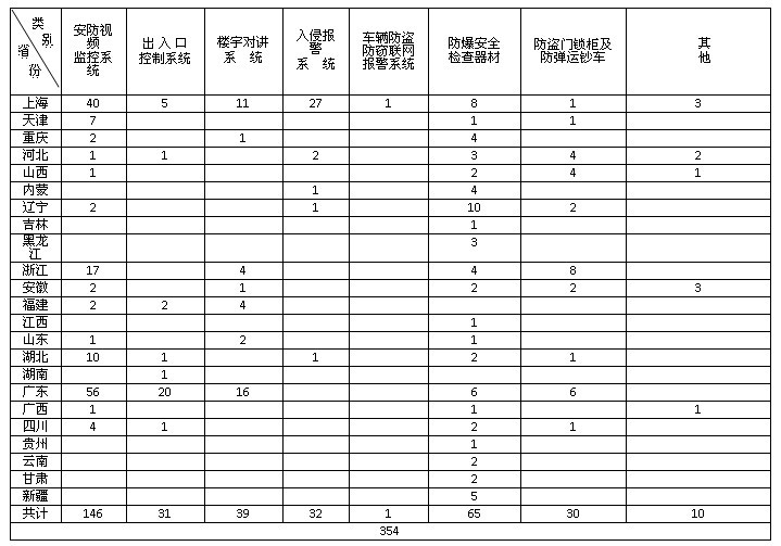 一、個省、自治區(qū)、直轄市獲得生產登記批準書的安防產品生產企業(yè)數量(354共家):