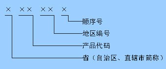 四、生產(chǎn)登記批準(zhǔn)書采用全國(guó)可識(shí)別的編號(hào)方法,由省(自治區(qū)、直轄市)簡(jiǎn)稱、產(chǎn)品代號(hào)、地區(qū)編號(hào)、順序號(hào)組成,如下圖所示: