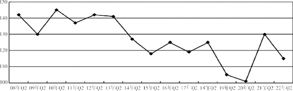 2022年二季度,我国安防行业景气指数为130,与上季度相比下降19个百分点,比去年同期下降39个百分点,位于"较景气区间"(见图11)。调查企业中,有43%的企业认为经营状况处于"良好"状态,与上季度相比下降12个百分点,比去年同期下降33个百分点;有44%的企业认为"一般或持平",比上季度上升5个百分点,比去年同期上升了27个百分点;有13%的企业反映经营处于"不佳"状况,比上季度上升了7个百分点,比去年同期上升了6个百分点。